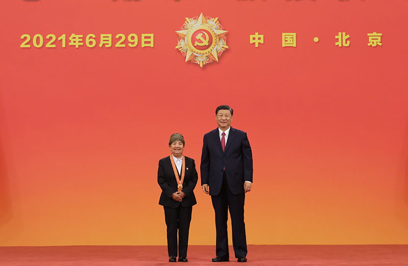 6月29日,慶祝中國(guó)共產(chǎn)黨成立100周年“七一勛章”頒授儀式在北京人民大會(huì)堂金色大廳隆重舉行。中共中央總書(shū)記、國(guó)家主席、中央軍委主席習(xí)近平向“七一勛章”獲得者卓嘎頒授勛章。新華社記者 李學(xué)仁 攝