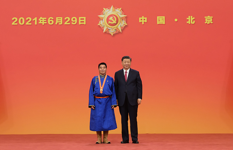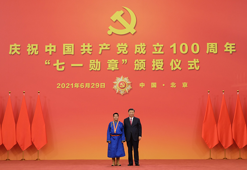 6月29日,慶祝中國(guó)共產(chǎn)黨成立100周年“七一勛章”頒授儀式在北京人民大會(huì)堂金色大廳隆重舉行。中共中央總書(shū)記、國(guó)家主席、中央軍委主席習(xí)近平向“七一勛章”獲得者廷·巴特爾頒授勛章。新華社記者 李學(xué)仁 攝
