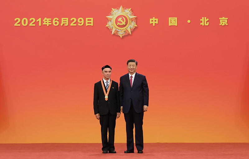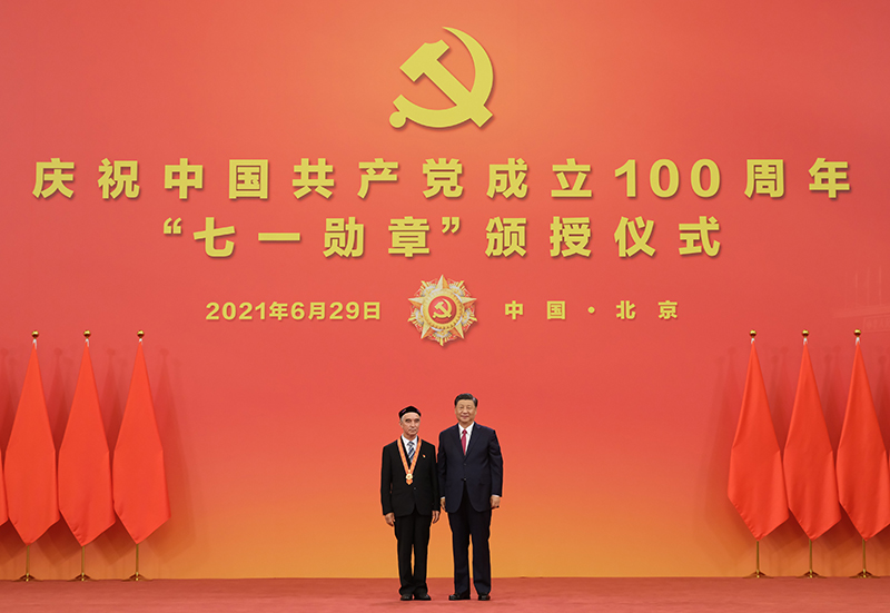 6月29日,慶祝中國(guó)共產(chǎn)黨成立100周年“七一勛章”頒授儀式在北京人民大會(huì)堂金色大廳隆重舉行。中共中央總書(shū)記、國(guó)家主席、中央軍委主席習(xí)近平向“七一勛章”獲得者買(mǎi)買(mǎi)提江·吾買(mǎi)爾頒授勛章。新華社記者 李學(xué)仁 攝