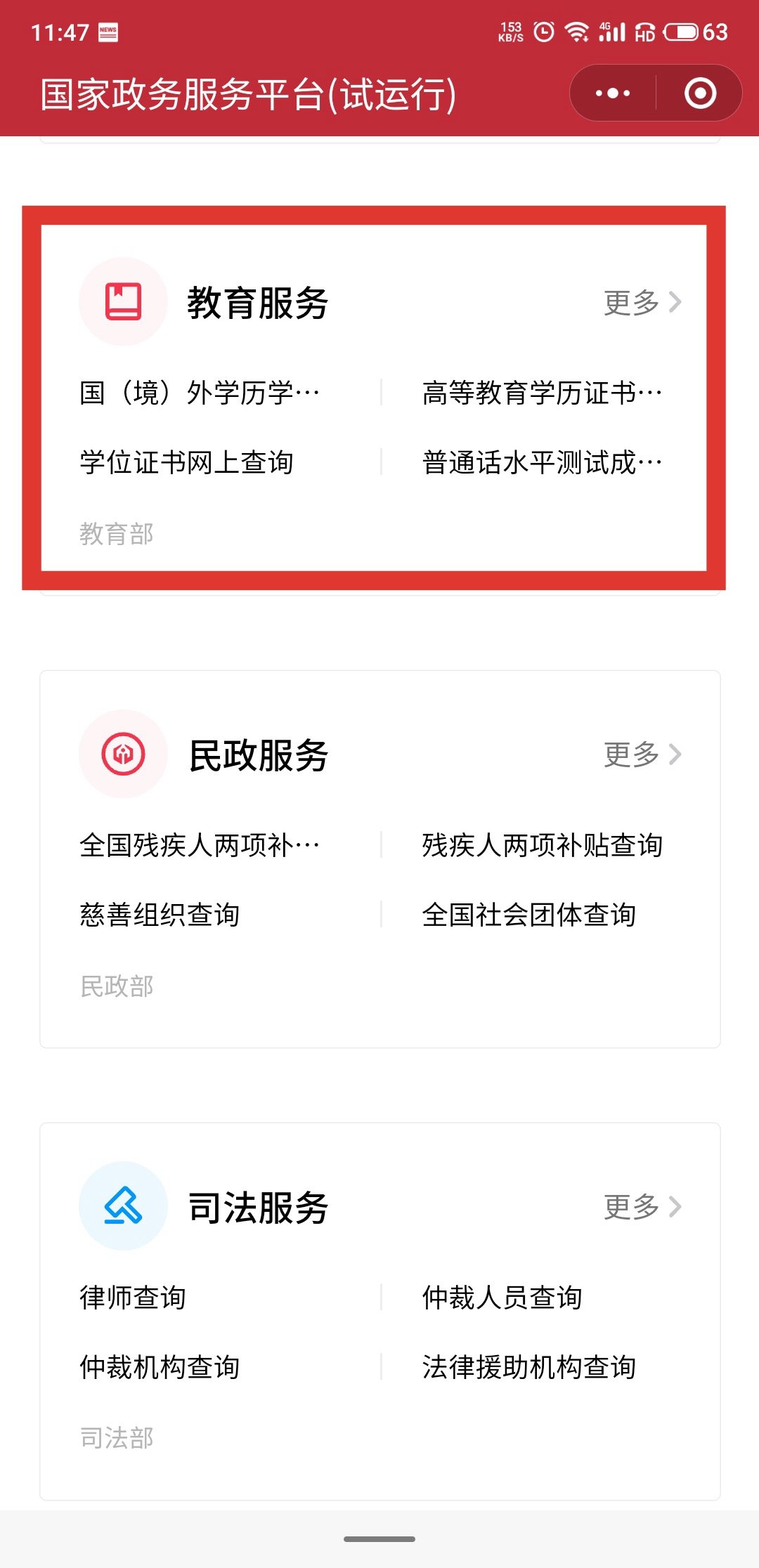 第一步:進入百度,搜索國家政務服務平臺小程序,進入小程序,找到教育服務,點擊『更多』