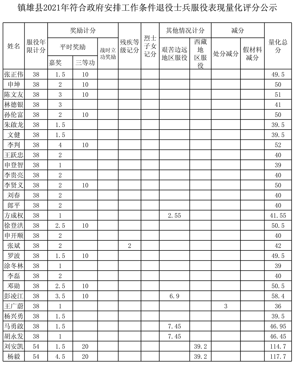 鎮(zhèn)雄縣2021年由政府安排工作退役士兵量化評(píng)分公示