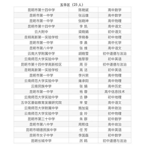 昆明市五華區(qū)關(guān)于第十一屆普通中學(xué)和中等職業(yè)學(xué)校學(xué)科帶頭人和骨干教師擬入選名單公示