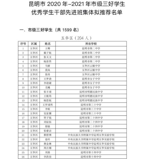 昆明市五華區(qū)關于2020—2021學年市級三好學生優(yōu)秀學生干部先進班集體擬推薦名單的公示