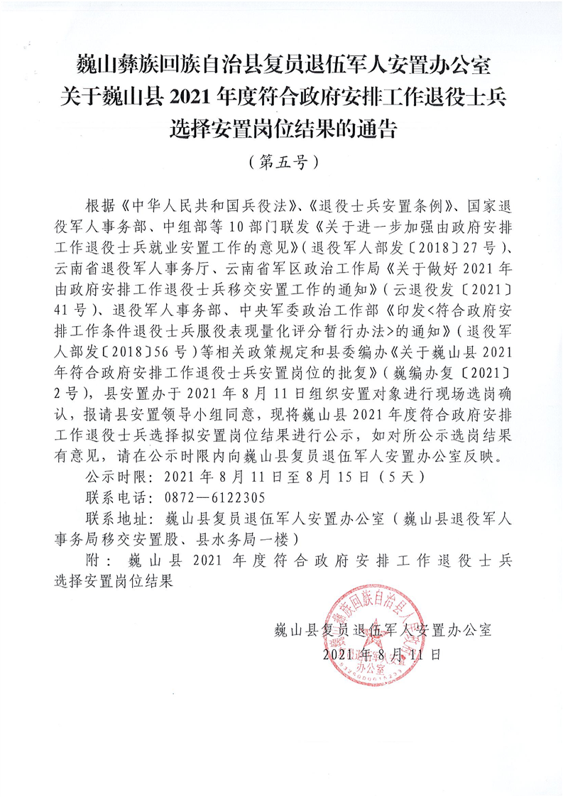 大理市巍山彝族回族自治縣復員退伍軍人安置辦公室關于巍山縣2021年度退役士兵崗位安置結果公示