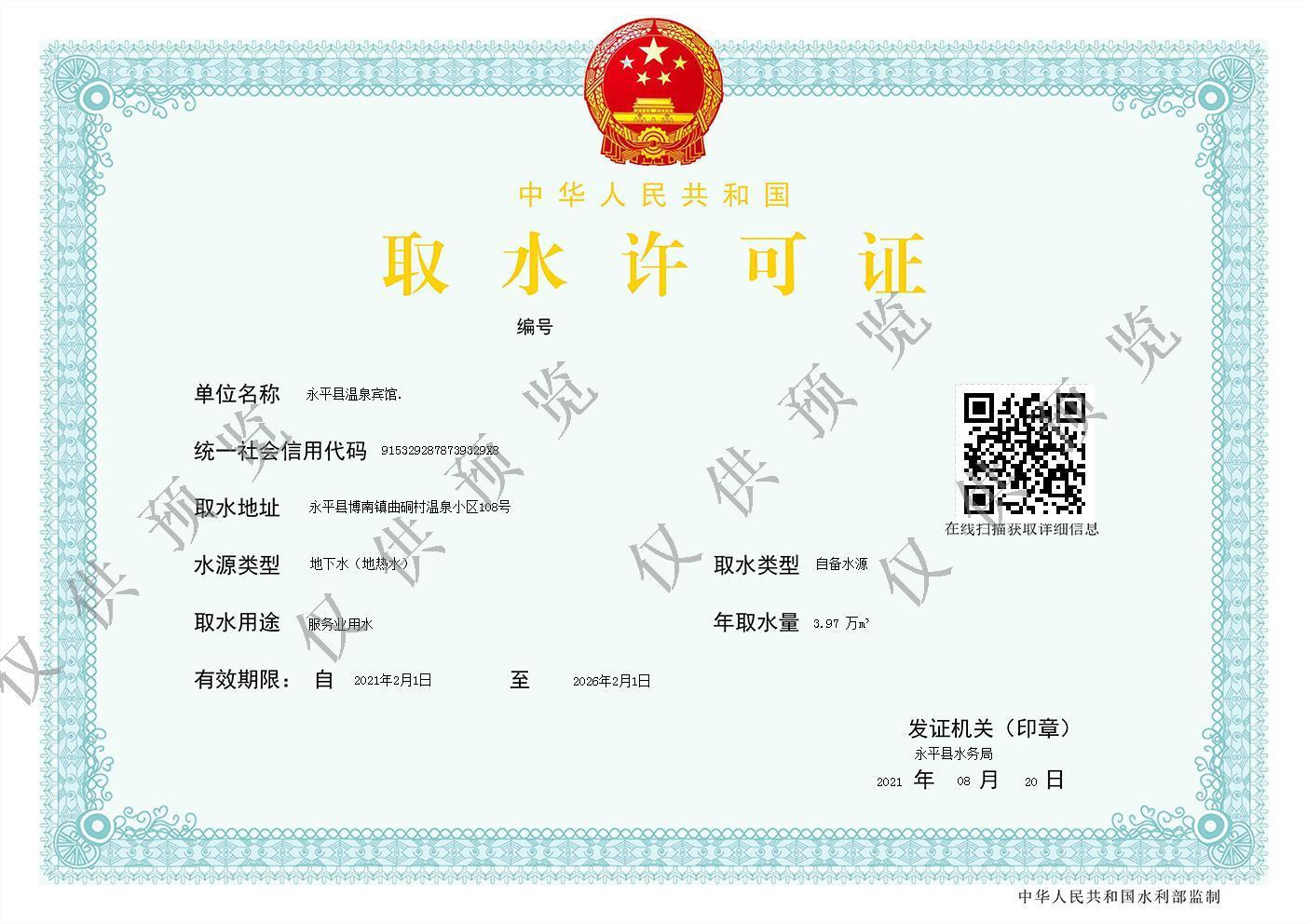 大理市永平縣水務(wù)局關(guān)于給予永平縣溫泉賓館核發(fā)取水許可證的行政許可決定