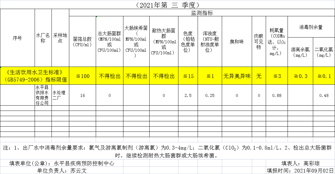 大理市永平縣城市水廠出廠水水質(zhì)信息