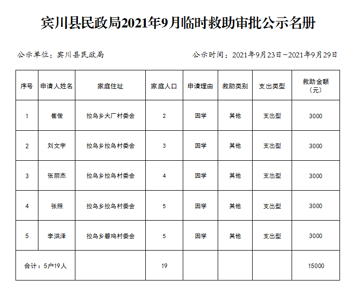 大理市賓川縣民政局2021年9月臨時救助審批公示