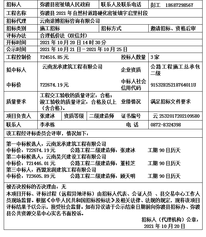 大理市彌渡縣2021年自然村道路硬化密祉鎮(zhèn)字啟里村段中標(biāo)候選人公示