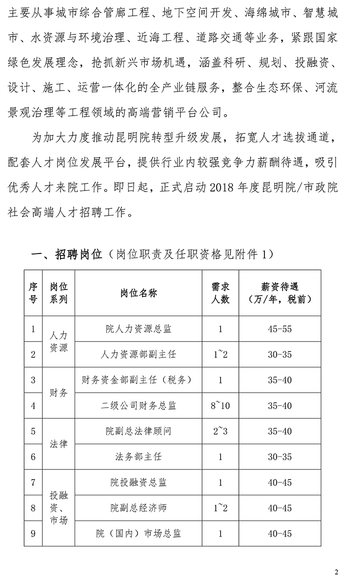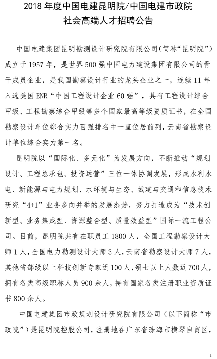 2018年度中國電建昆明院/中國電建市政院社會(huì)高端人才招聘公告