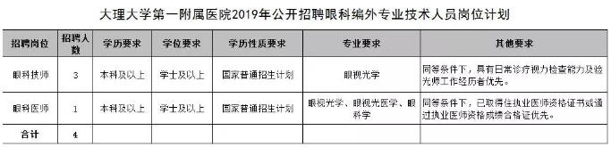 因工作需要,大理大學(xué)第一附屬醫(yī)院眼科面向社會公開招聘編制外專業(yè)技術(shù)人員4名,現(xiàn)將有關(guān)招聘事宜公告如下:
