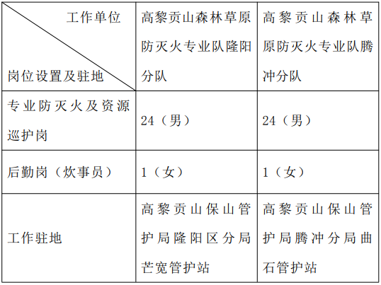 現(xiàn)因工作需要,云南騰森人力資源服務(wù)有限責任公司面向社會公開招聘高黎貢山森林草原專業(yè)防滅火隊員,派遣到高黎貢山自然保護區(qū)保山管護局森林草原防滅火專業(yè)隊工作,現(xiàn)將招聘事宜公告如下: